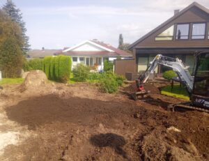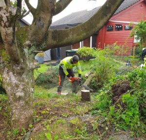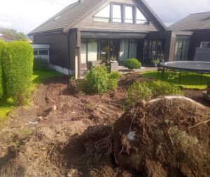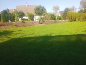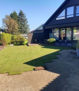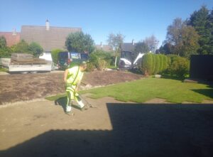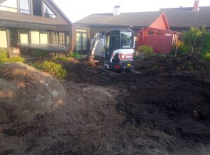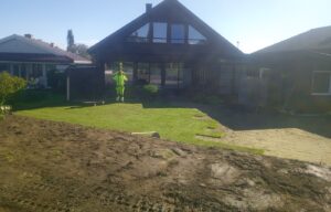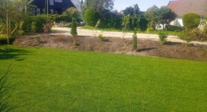 Hage fornying. Kunde har fått ny avrettet hage med ny ferdigplen, planter og en epletre hekk.