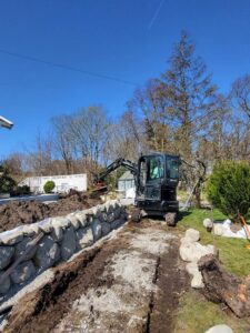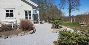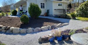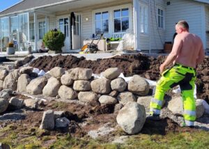 Landskapsutforming med grunnarbeid til nye stier, murer og flytting av planter. Morene steins murer er opparbeidet for å få mindre helning i bed og lettere tilkomst. Steinkjede er montert for å gi en fin innramning. Og plen er planert og reetablert.